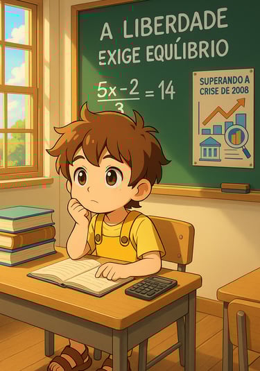 Lucas se depara com um problema matemático complexo na escola, mas, ao resolvê-lo, percebe que a vida também é feita de cálculos e escolhas. Ele aprende sobre a importância de tomar decisões baseadas em dados e lógica, mas sem perder a humanidade. O caso de uma empresa que superou a crise financeira de 2008 usando análise de dados é mencionado. No final, ele encontra outra pista: "A liberdade exige equilíbrio."