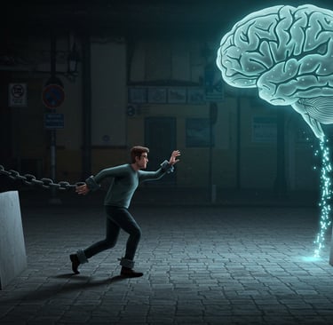 A imagem acima mostrar uma pessoa tentando avançar, mas presa por correntes invisíveis, ela pensa em palavras como 'não sou bom o suficiente', 'não consigo', 'não mereço'. Ao fundo, uma representação do cérebro demonstrando que essas barreiras são criadas pela própria mente.